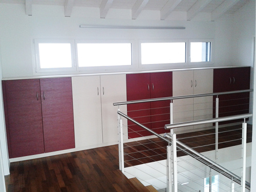 Holzelementbau mit hinterlüfteter Putzträgerplatten und gehärteten Acryl-Polyurethan-Harzenplatten. Spezielle Innentreppe mit integriertem Bücherregal und Einbauschrank. Heizung mit wassergeführtem Cheminée und Warmwassersonnenkollektoren.