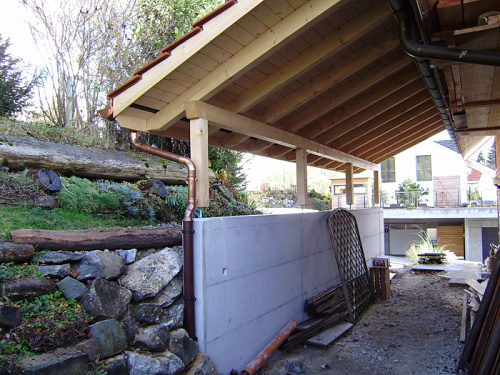 Wintergarten und Massagezimmer in Holzelementbau mit Lärchenschuppenschalung und begehbare Terrasse sowie Metallwendeltreppe.